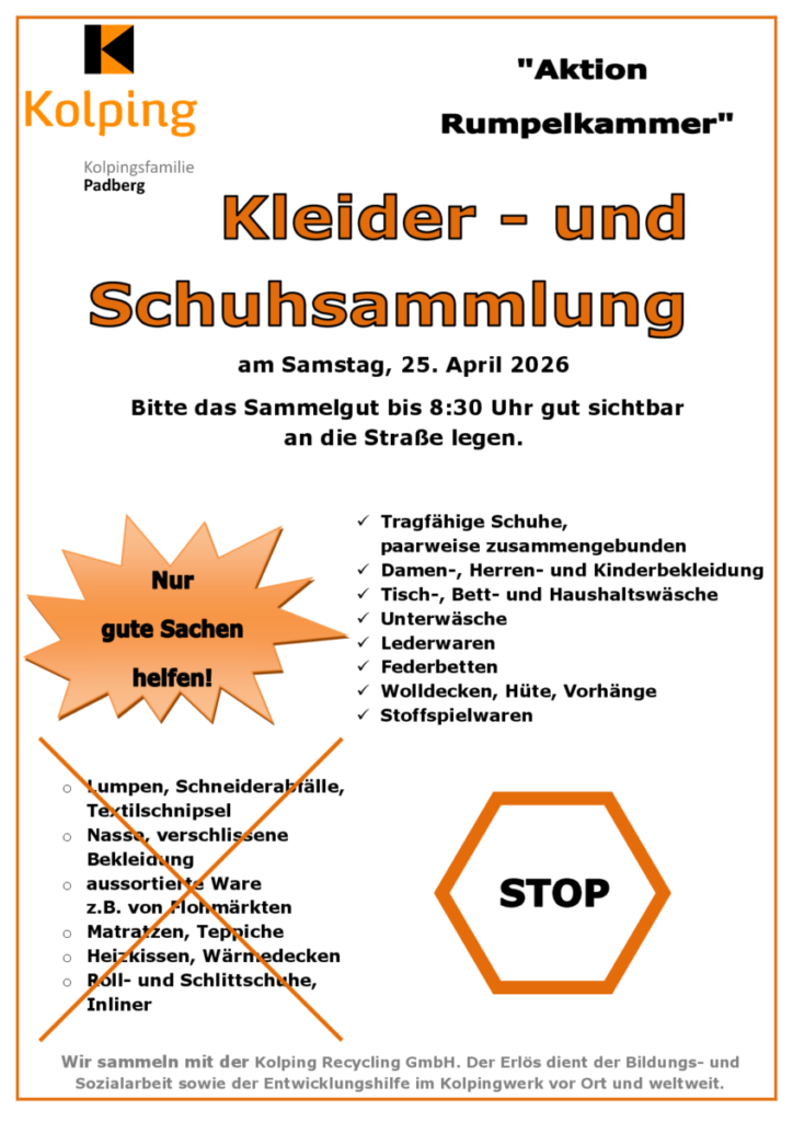 Die Kolpingsfamilie Padberg sammelt am 25.04. eure Altkleider für einen guten Zweck (in Padberg und Helminghausen). Säcke zum Befüllen liegen dem Diemelboten bei und werden bei Stüttem im Laden ausgelegt.